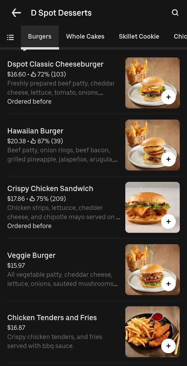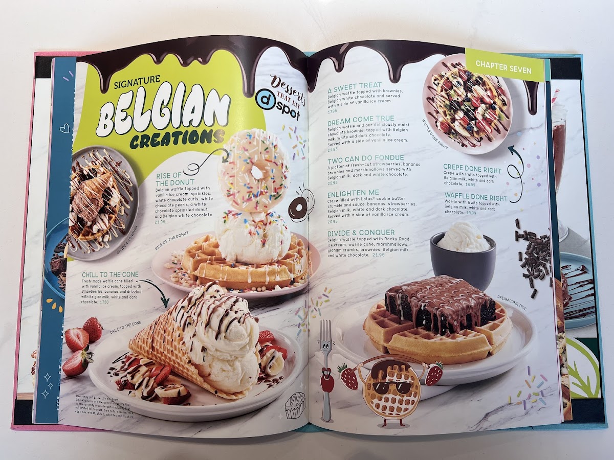 Pancakes: The pancake selection includes options like Cookie Dough Pancakes topped with cookie dough pieces and Belgian chocolate, Buttermilk Pancakes served with maple syrup, Strawberry Cheesecake Pancakes featuring cheesecake bites and strawberry coulis, and Apple Pie Pancakes.