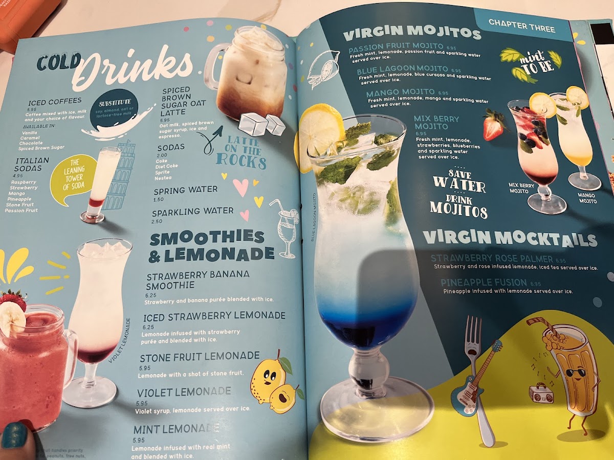 Cold Drinks & Smoothies: The beverage menu includes iced options such as Strawberry Lemonade Smoothie, Vanilla Iced Coffee, Passionfruit Iced Tea, and fruit-based mojitos like the Blue Lagoon Mojito and Stone Fruit Orange Mojito. Bottled spring water and classic soft drinks like Coke are also available.